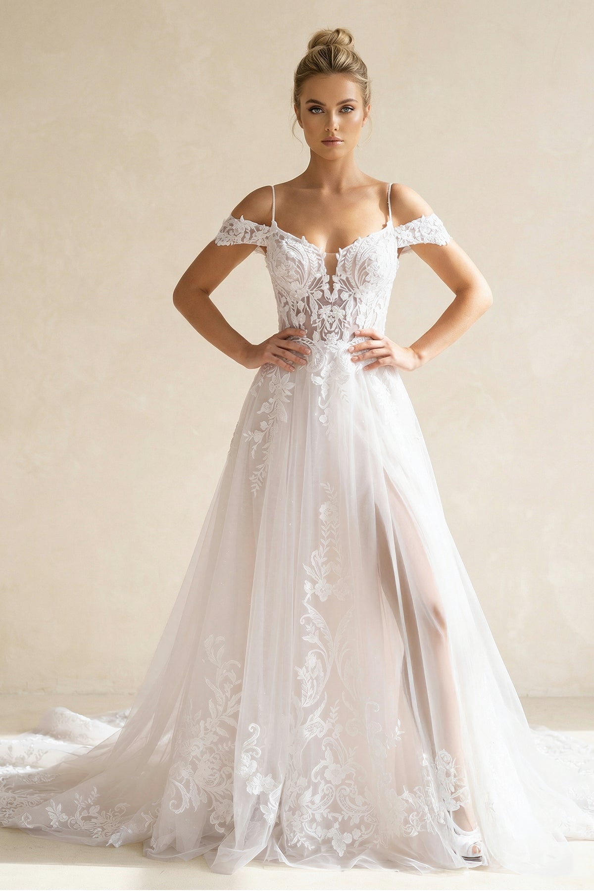 This Sheisme A-line wedding dress pairs white lace with a nude underlay for dimensional depth. The off-the-shoulder neckline creates a sculpted frame across the collarbone, while intricate appliques define the bodice with precise texture. From a structured waist, the skirt falls into a sweeping A-line silhouette, enhanced by a front slit that introduces fluid movement. A covered button back adds classic bridal detail. Ideal for a Church Wedding, Formal Outdoor Wedding, or Destination Wedding.