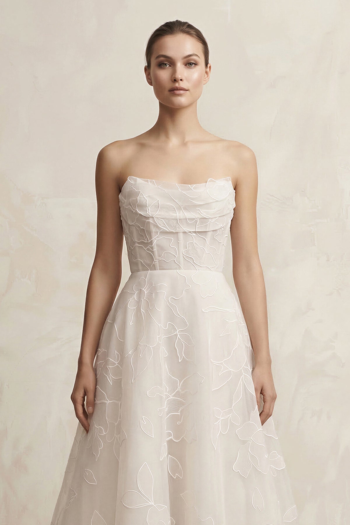 From placed flowers to draping and beadwork, each detail is finished by hand for a couture-inspired look.