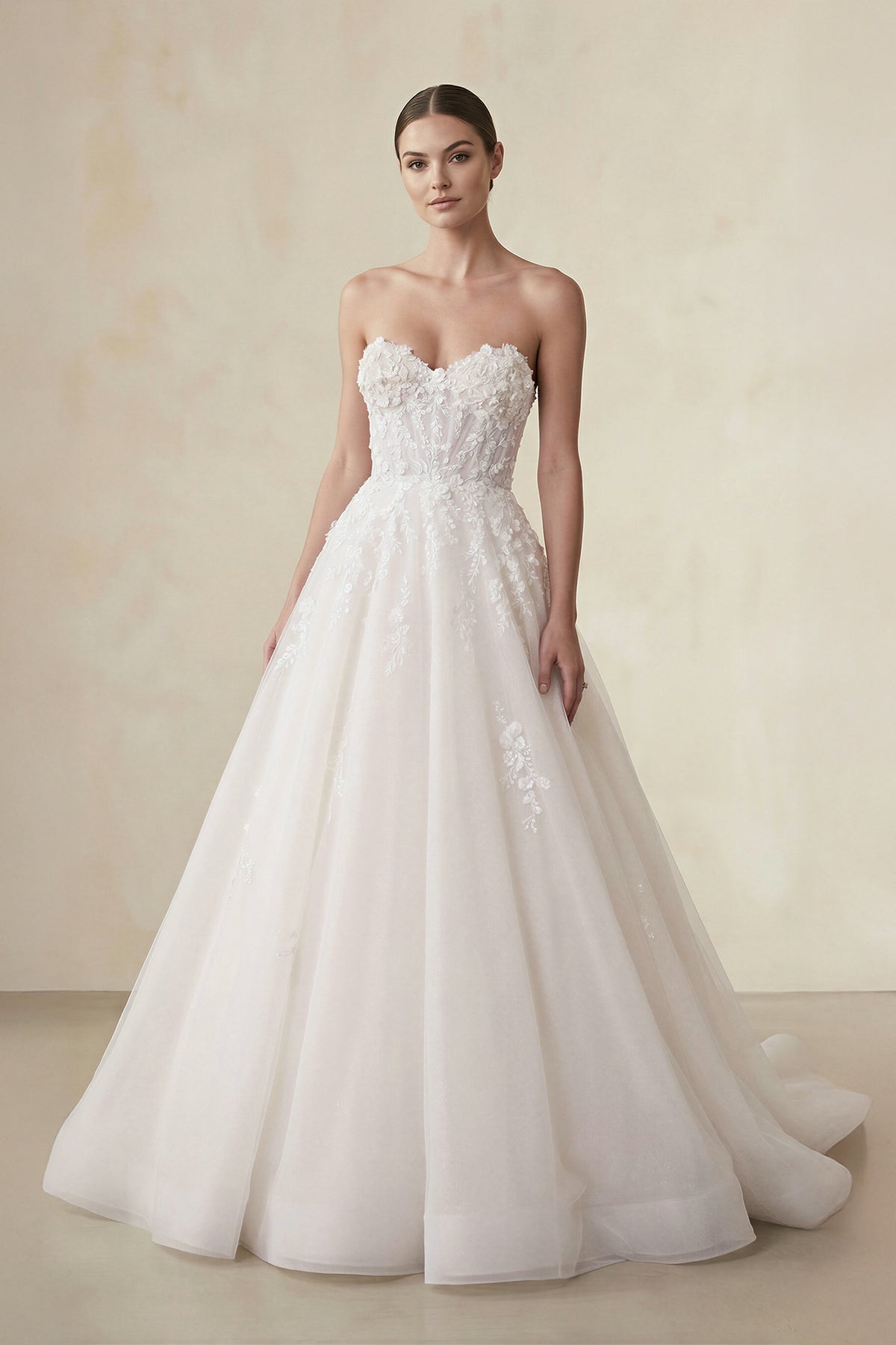 Airy structure and refined detail define this Sheisme strapless A-line wedding dress in ivory. Crafted from layered tulle, the sculpted bodice is adorned with delicate appliques that create subtle dimension and texture. The clean strapless neckline frames the shoulders with precision, while the defined waist flows into a sweeping A-line skirt with soft movement and balance. A covered-button back completes the look with classic bridal polish. Ideal for a Church Wedding, Garden Wedding, or Destination Wedding.