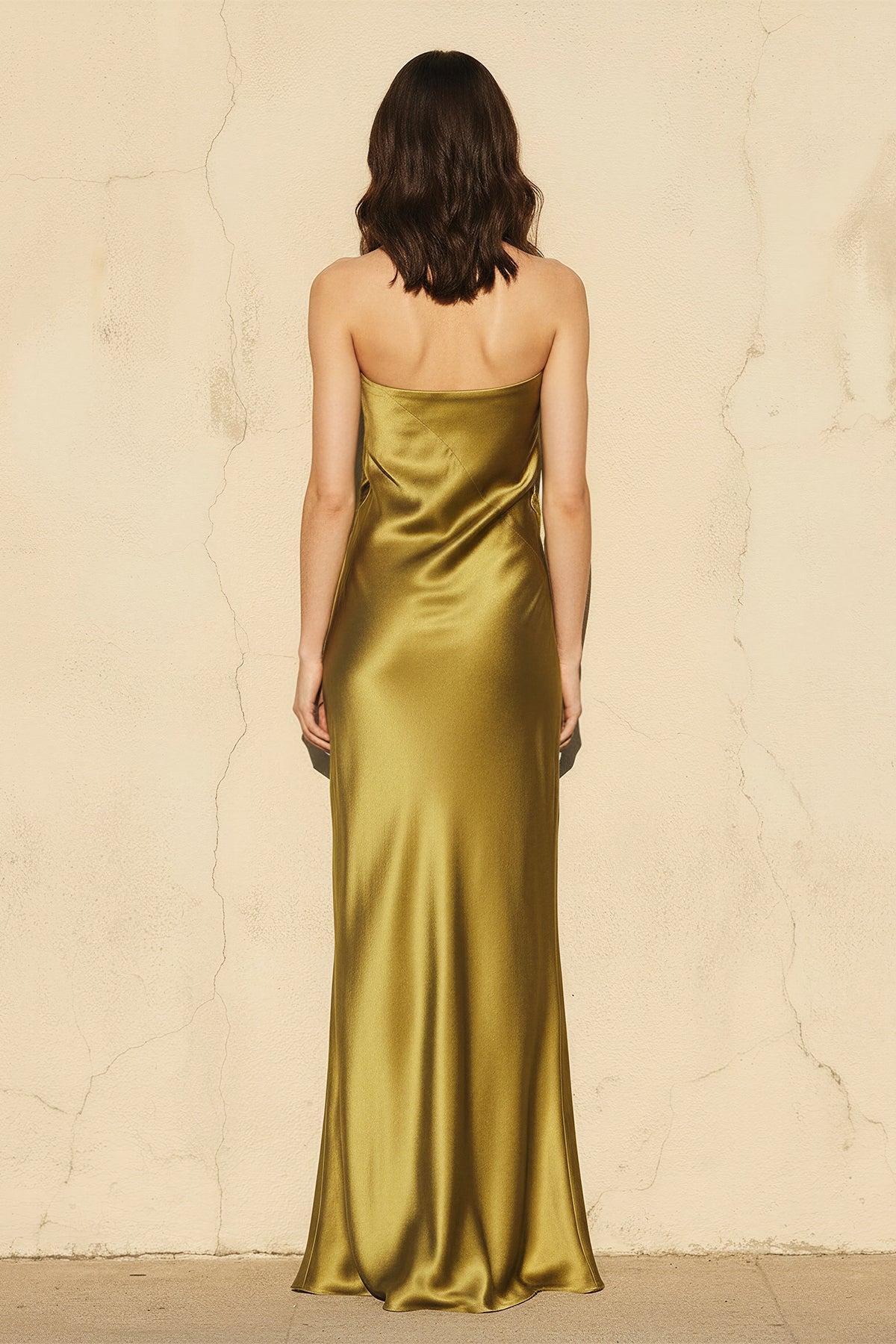 Elevate your evening with the Sheisme olive satin strapless sheath maxi evening dress and formal dress, designed for effortless sophistication. The strapless neckline highlights the shoulders, while the sleeveless cut ensures a sleek, modern silhouette. Crafted from smooth satin, the sheath style skims the body gracefully, finishing at a floor-length hem that flows elegantly. A side zipper provides a secure, tailored fit. Perfect for weddings, galas, and other formal evening occasions where elegance is key.