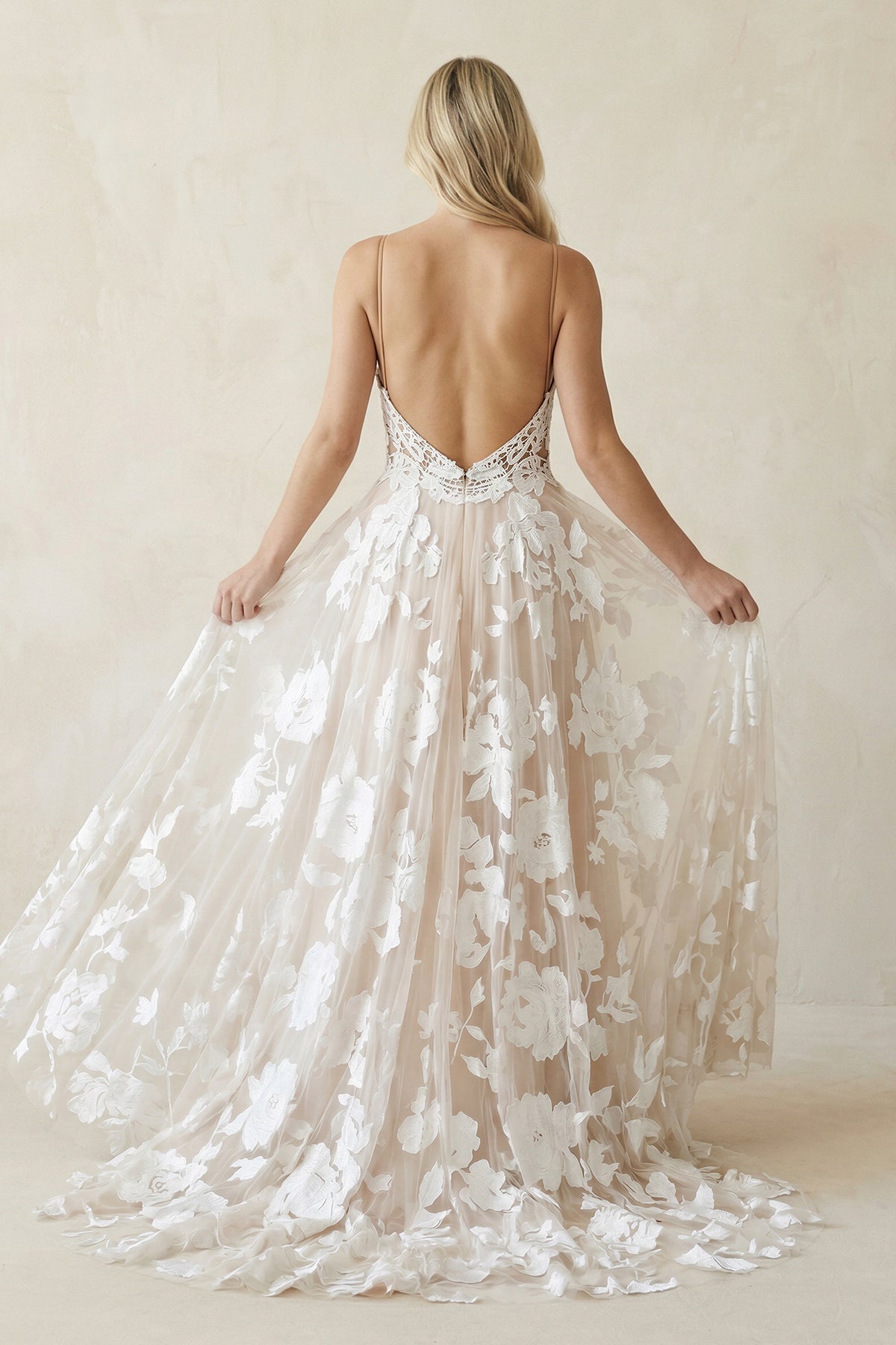 From placed flowers to draping and beadwork, each detail is finished by hand for a couture-inspired look.