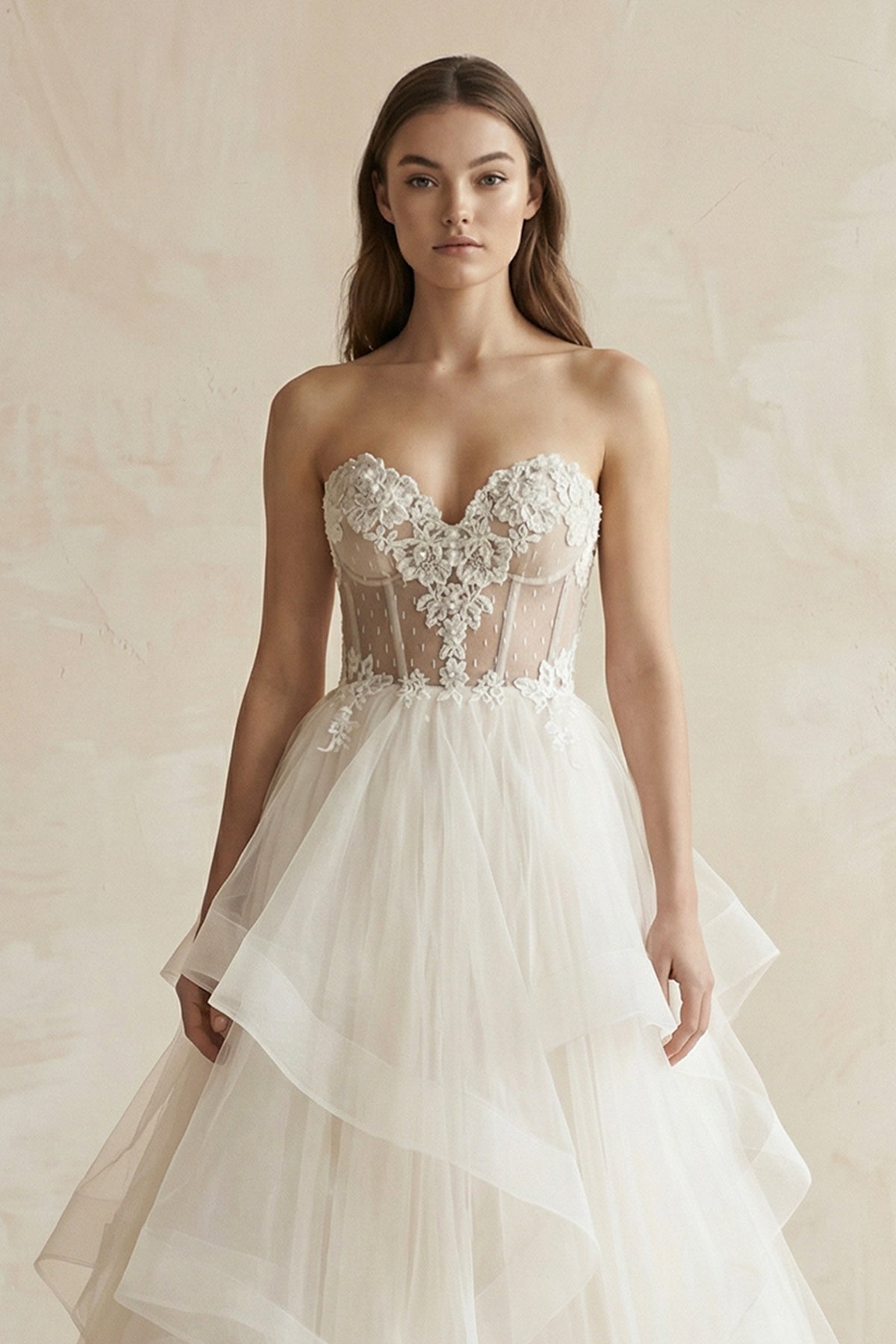 Hidden corsetry provides shaping and stability, keeping the dress perfectly in place through any movement.