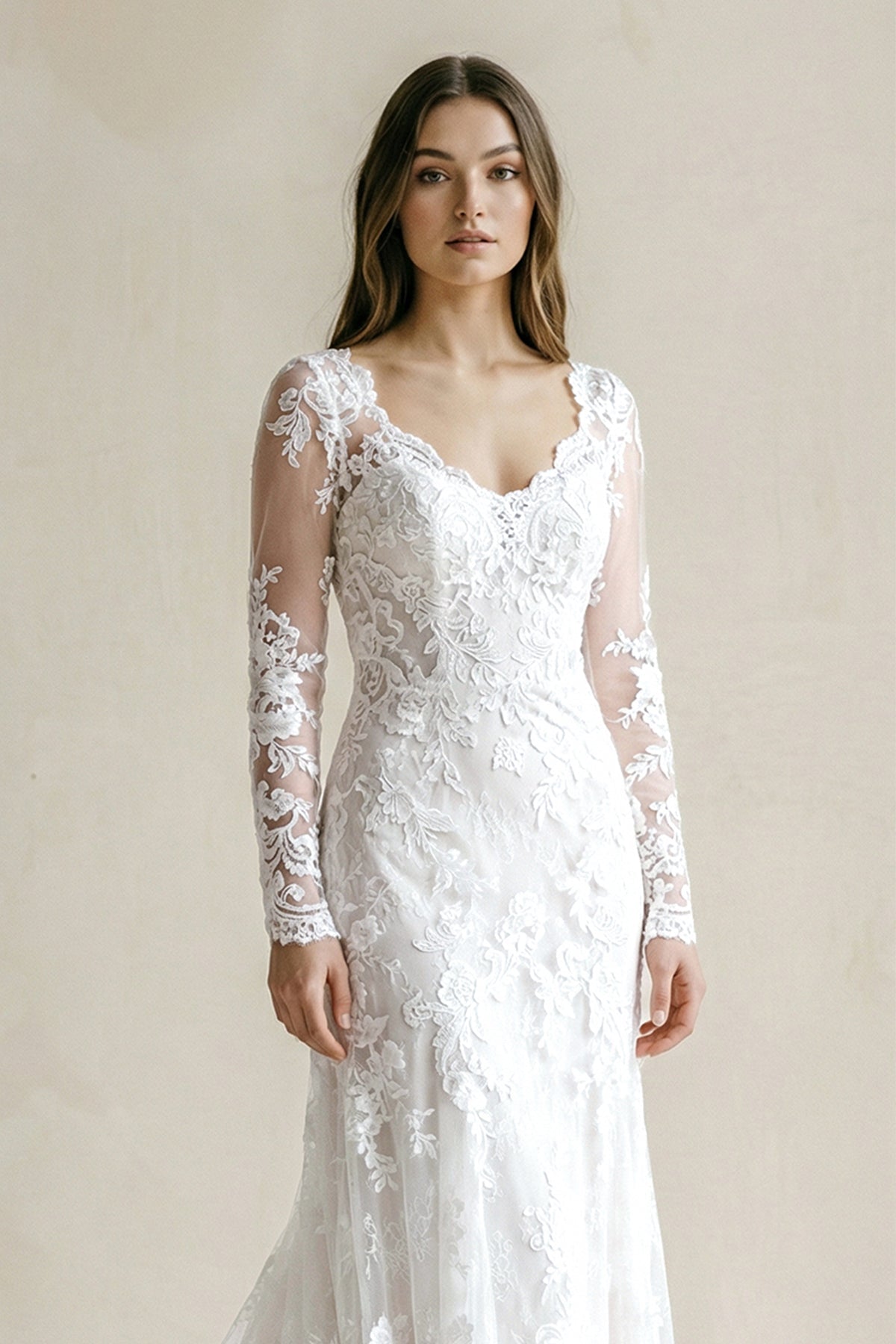 Designed as a continuous expression rather than separate elements, this white lace mermaid gown by SHEISME carries its detail seamlessly from top to hem. The V-neckline opens the frame with ease, while long sleeves extend the lace pattern, creating a unified, flowing look.Appliqué is layered with precision, blending into the lace rather than sitting on top of it. The silhouette follows the body closely, then extends into a soft sweep train, maintaining that sense of continuity in both texture and line.Perfect for formal ceremonies, classic venues, or brides drawn to cohesive, detail-driven design. Available in inclusive sizes 0–30 with free custom sizing for a personalized, flawless fit.