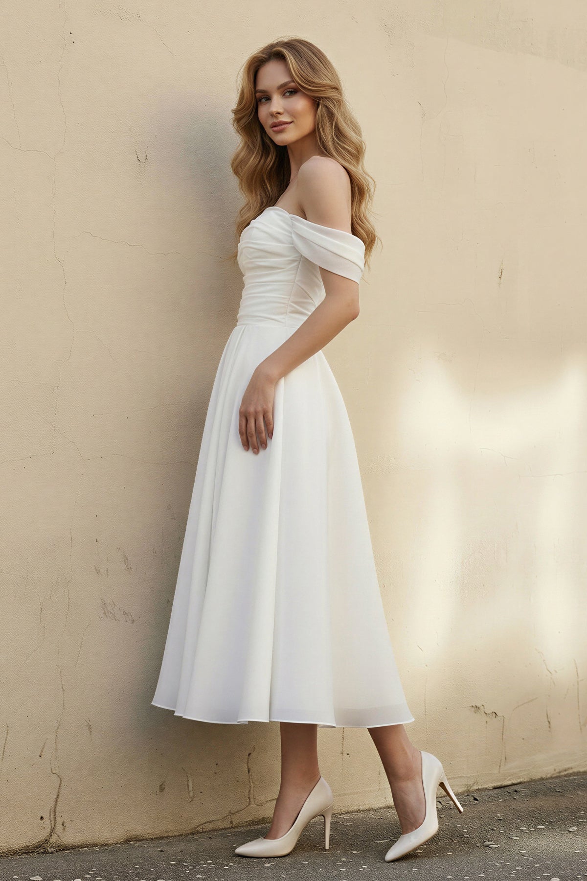 Discover modern bridal charm with this white off-the-shoulder A-line organza wedding dress by SHE IS ME. Designed with a softly ruched bodice, elegant fold-over neckline, and a flowing tea-length skirt with a front slit, this gown creates a feminine silhouette. The airy organza fabric adds graceful movement while highlighting the waist for a flattering fit. Perfect for a Courthouse Wedding, Garden Wedding, Civil Ceremony, Destination Wedding, Outdoor Wedding, or Intimate Church Wedding, it’s a refined choice for brides who love effortless elegance with a contemporary touch.