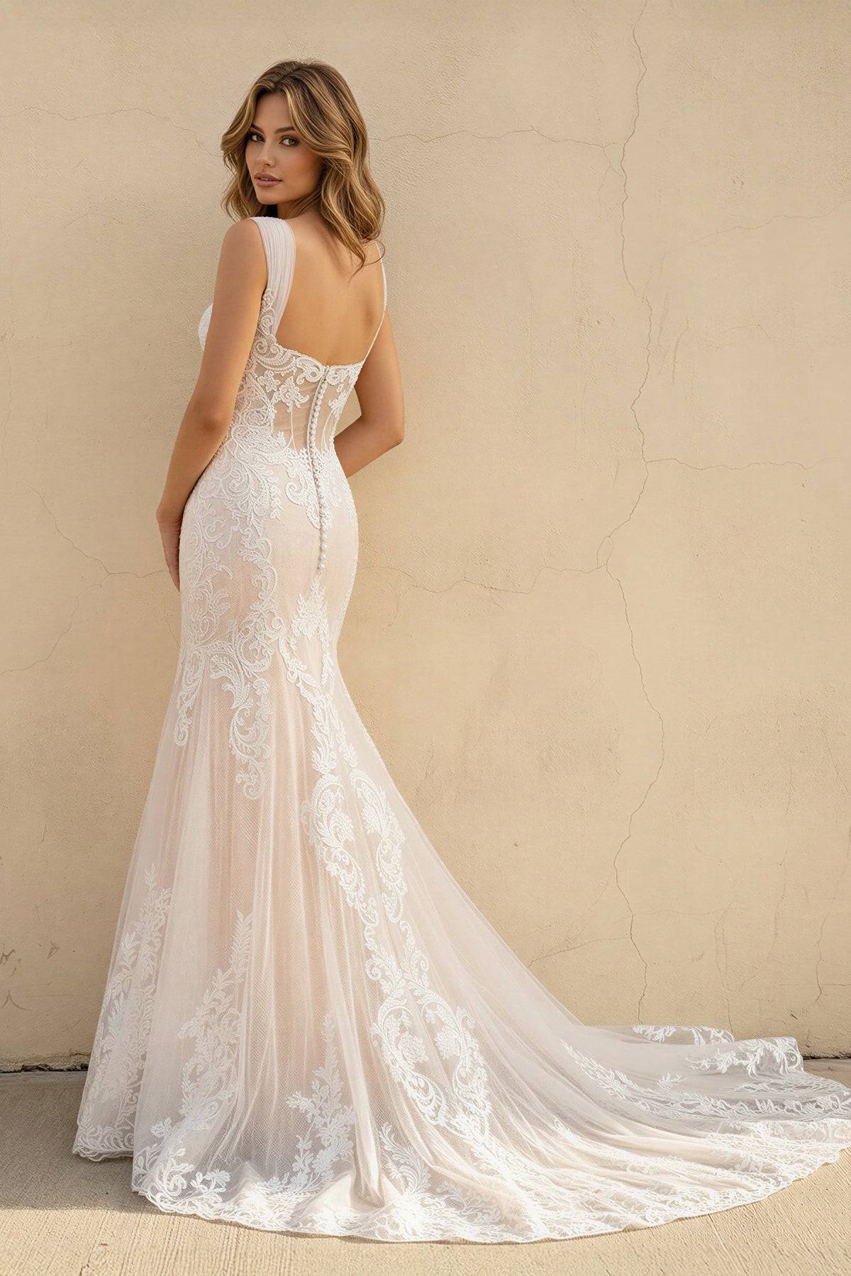 Turn heads in this SHE IS ME V-neck mermaid lace wedding dress in white and nude. Designed with a sculpted silhouette, delicate floral lace, and a flattering deep V neckline, this gown beautifully contours the body while adding romantic texture. The soft nude underlay enhances the intricate lace details, and the flowing train creates graceful movement. Perfect for a Garden Wedding, Beach Wedding, Church Wedding, Destination Wedding, or Elegant Evening Ceremony.