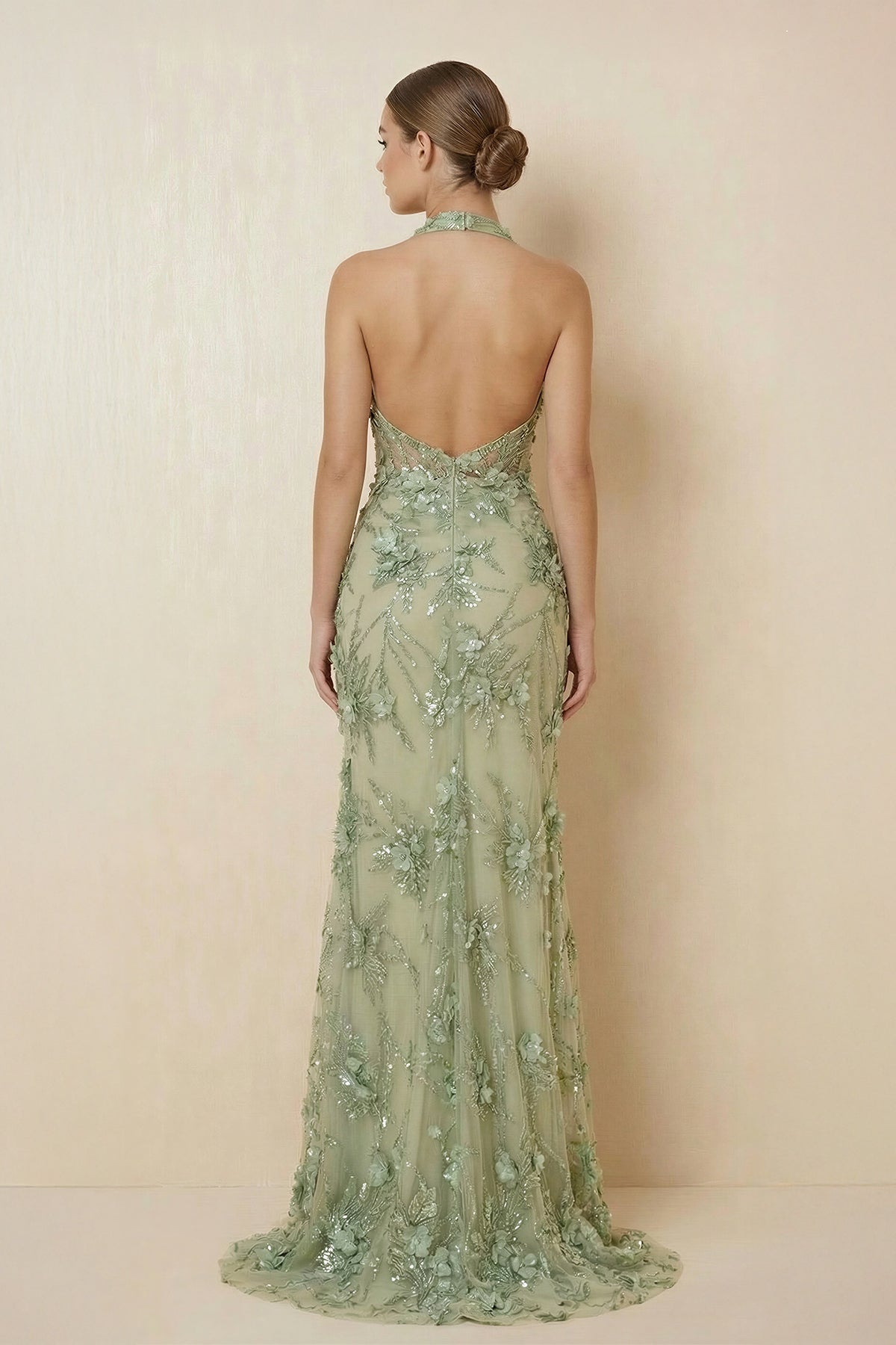 This SHE IS ME sage halter mermaid maxi dress is designed to create a refined statement with soft romance. Crafted from sheer tulle fabric, the gown is adorned with intricate floral appliqués and subtle beading that add texture and dimension throughout. The halter neckline draws attention to the shoulders, while the backless design enhances the look with modern allure. Fitted through the bodice and hips, the mermaid silhouette flows into a floor-length skirt with a thigh-high slit for effortless movement. Perfect for prom, formal events, evening events, or any occasion, this dress blends elegance with contemporary femininity.