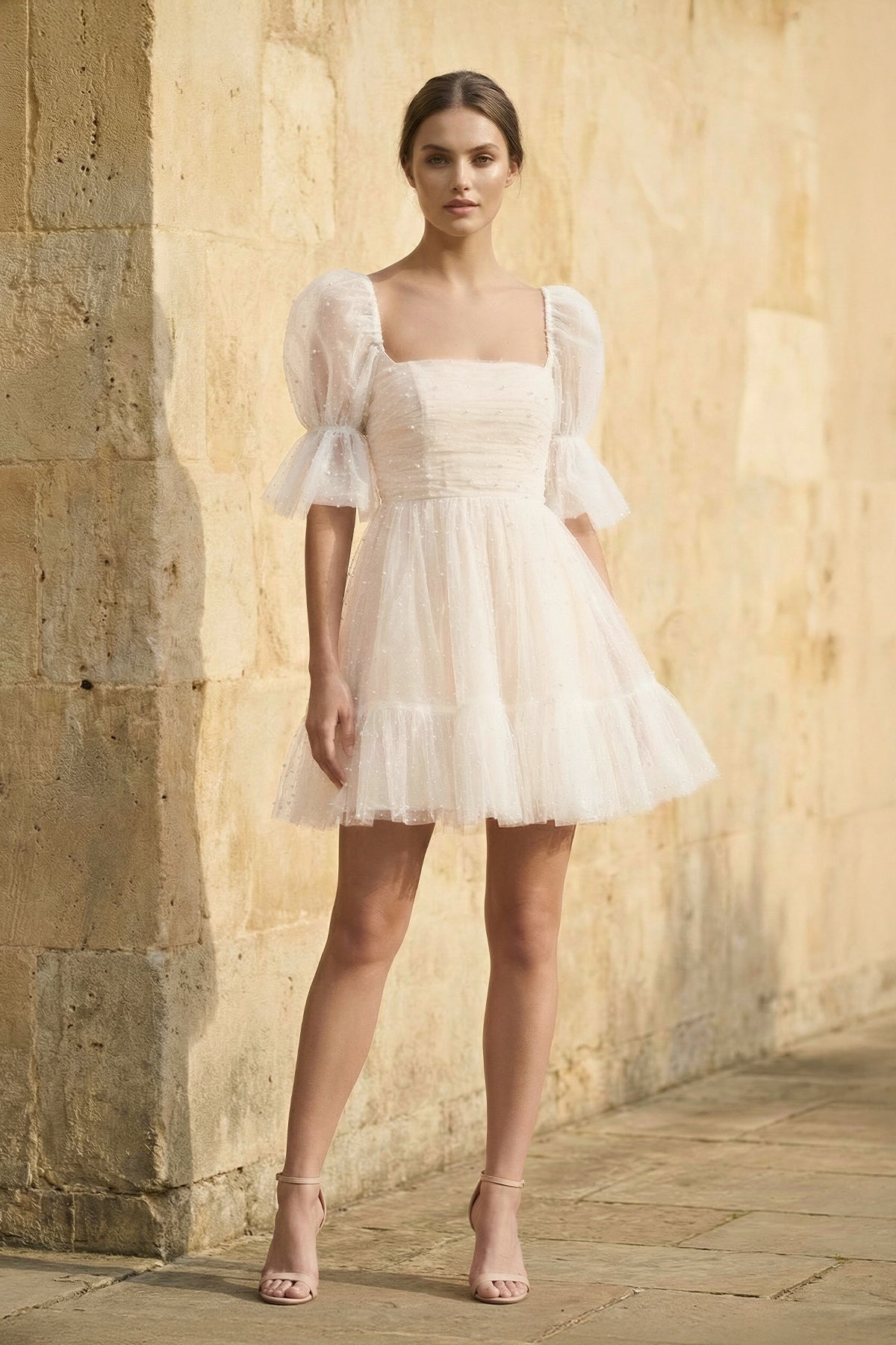 Step into playful bridal charm with this white and nude A-line short-sleeved tulle wedding dress by SHE IS ME. Featuring a square neckline, soft puff sleeves, and a layered tulle skirt with delicate shimmer, this short bridal gown feels light, romantic, and modern. Perfect for a Courthouse Wedding, Garden Wedding, Civil Ceremony, Destination Wedding, Outdoor Wedding, or Reception, it’s a sweet choice for brides seeking a chic mini wedding look.