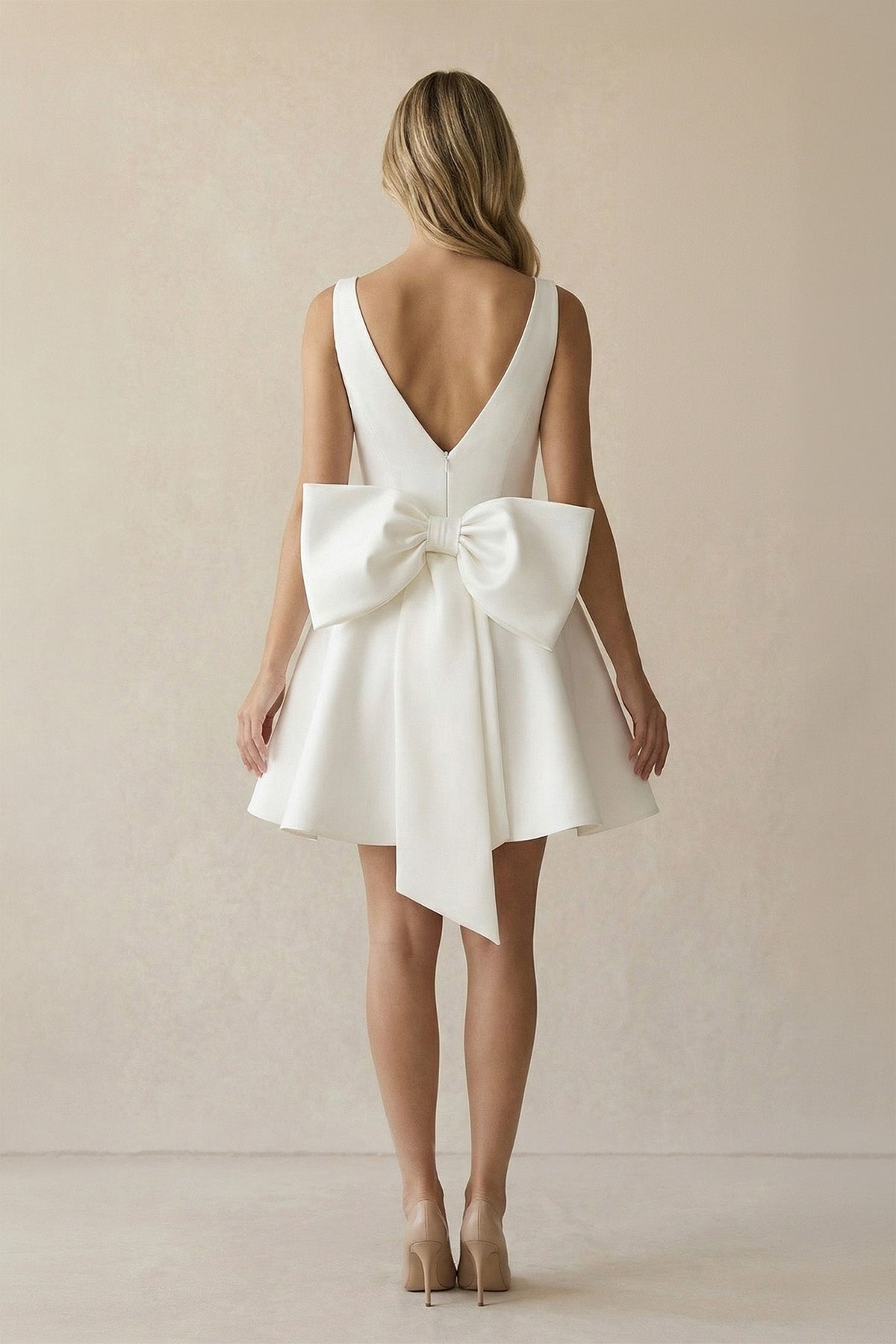 • A Line V Neck Satin Wedding Dress With Bow in Ivory - SHE IS ME Wedding Dresses