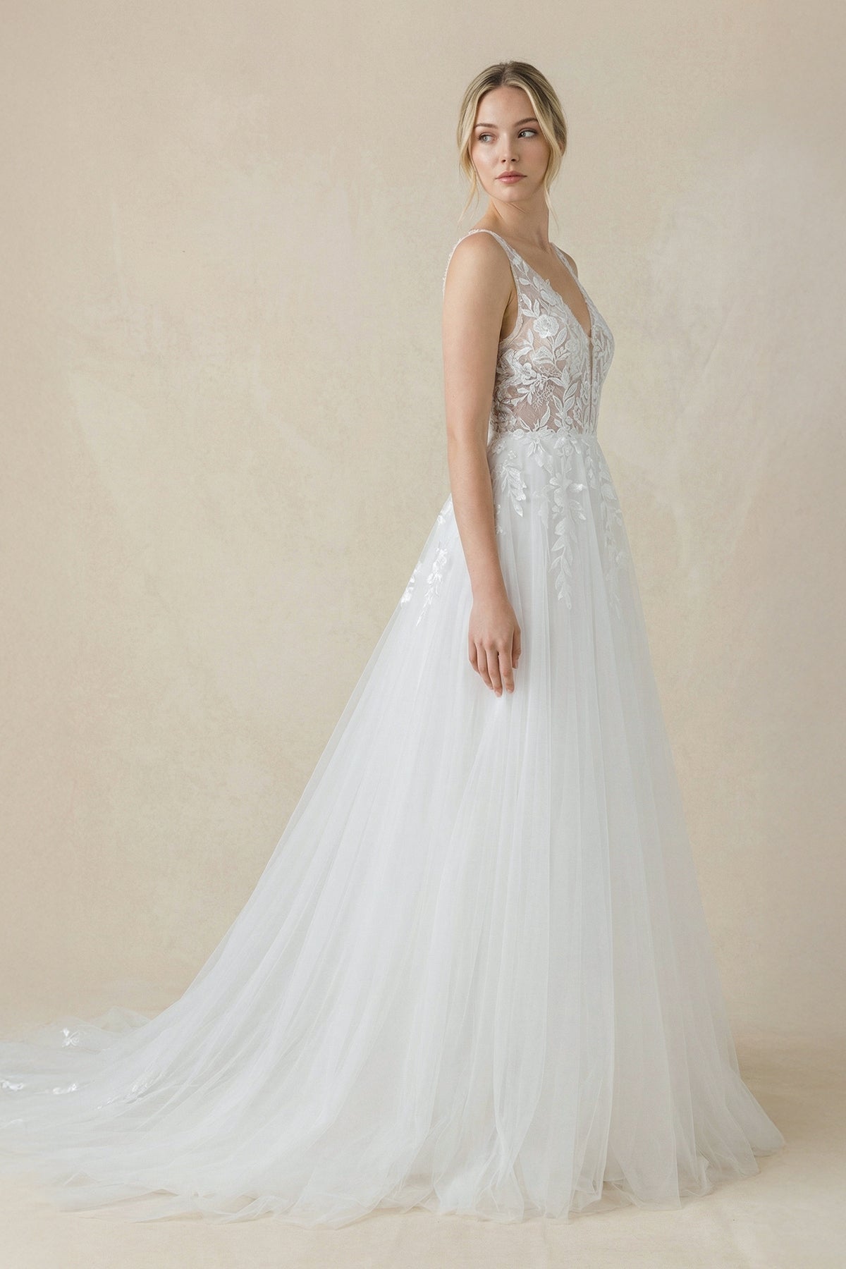 From placed flowers to draping and beadwork, each detail is finished by hand for a couture-inspired look.