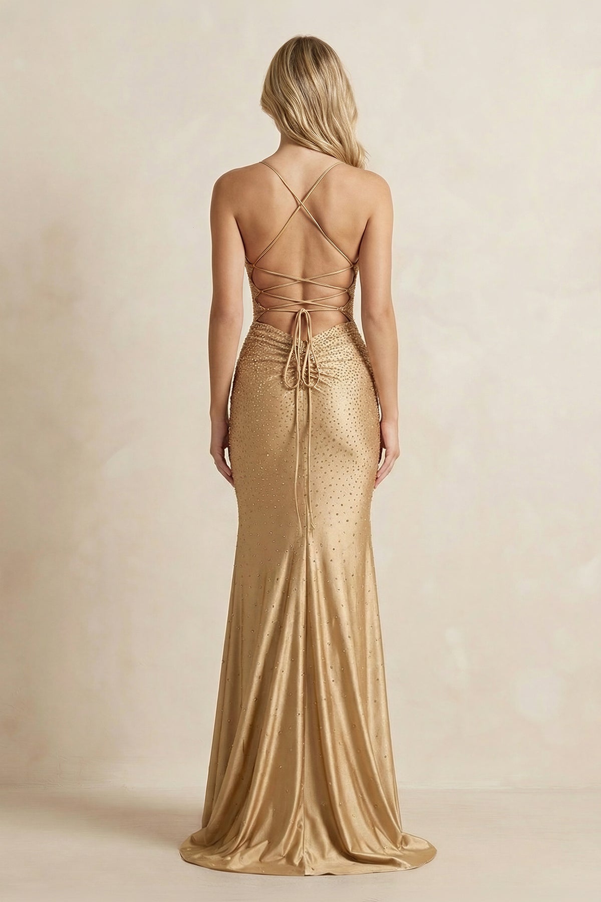 Shimmer with effortless glamour in this SHE IS ME gold mermaid maxi dress, designed with delicate spaghetti straps and a sleek, curve-enhancing silhouette. The Spaghetti Straps bodice is adorned with subtle beading that catches the light from every angle, while the fitted skirt flows into a graceful mermaid finish. A thigh-high slit adds a bold touch of drama and movement, making this gown perfect for prom, formal evenings, galas, and any occasion where sparkling elegance is the dress code.