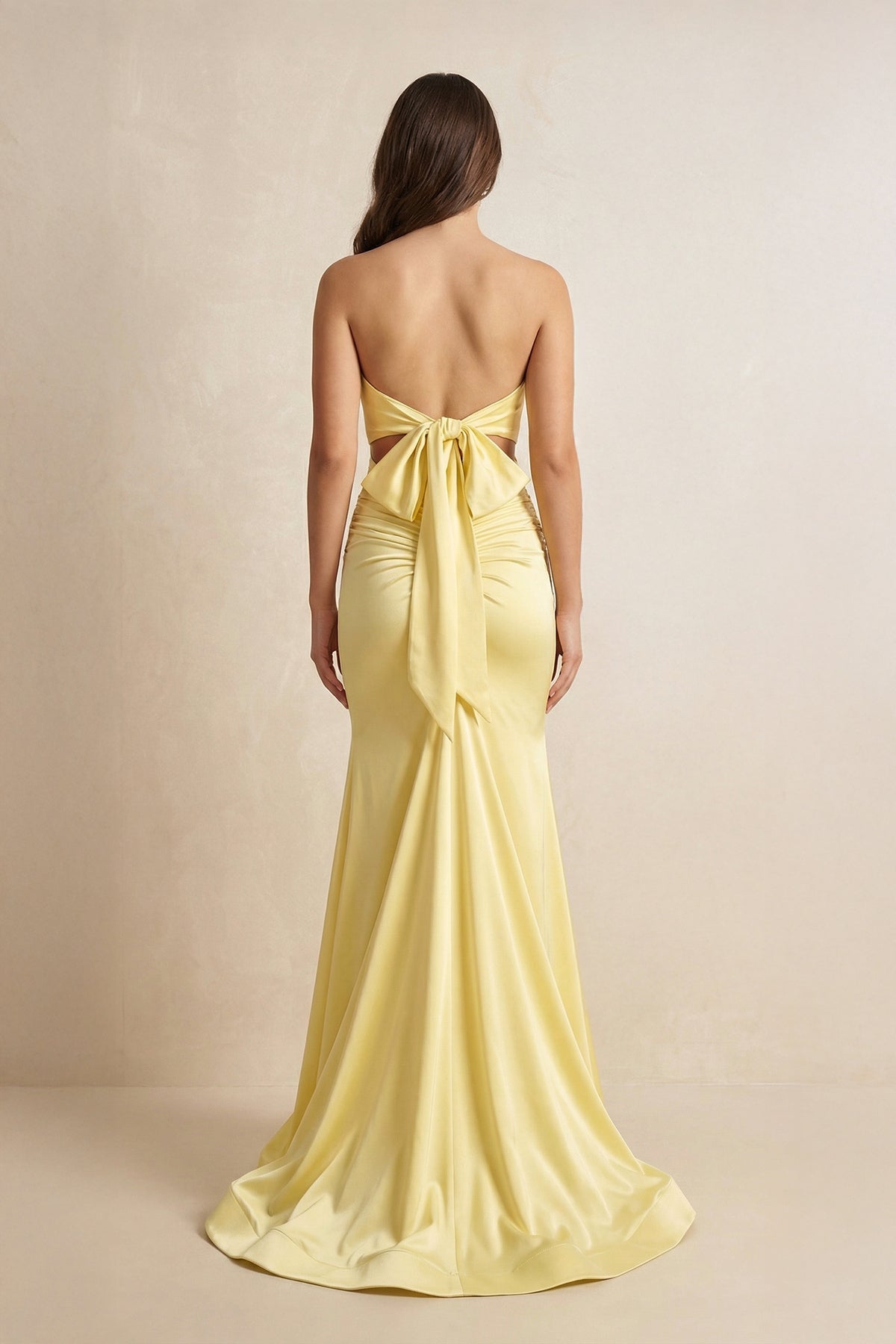 Elegant with a hint of bold allure, this SHE IS ME yellow sweetheart mermaid maxi dress is designed to highlight your natural curves in the most radiant way. The sweetheart neckline creates a timeless silhouette, while the fitted mermaid shape hugs the body before flowing into a graceful floor-length finish. A thigh-high slit adds modern sophistication, and the open back detail completes the look with an unforgettable statement. Perfect for prom, formal evenings, and special celebrations, this gown brings sunshine-bright glamour to every entrance.