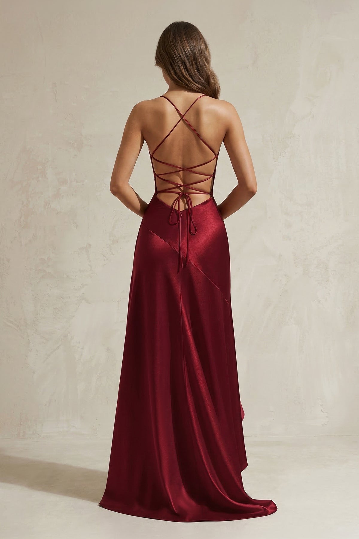 Elevate your formal look in the Sheisme burgundy satin sheath maxi dress. Featuring delicate ruffles and a subtle slit, the dress combines elegance with a touch of playful movement. The spaghetti straps and lace-up back provide a flattering fit while highlighting the shoulders. Sleeveless design ensures comfort and sophistication. Perfect for evening galas, weddings, formal dinners, and upscale celebrations, this maxi dress blends classic charm with contemporary style for unforgettable occasions.