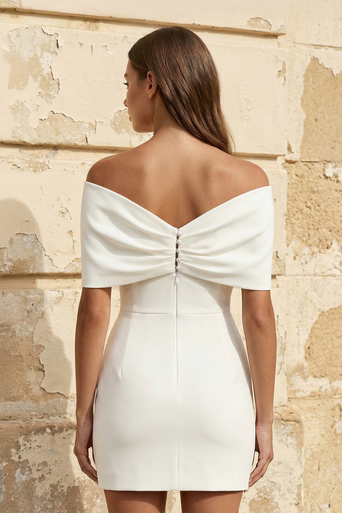 Turn heads in this SHE IS ME sheath off-the-shoulder satin wedding dress in white. Designed with a sleek silhouette, this mini bridal gown features an elegant fold-over neckline with a statement bow detail that highlights the shoulders beautifully. The smooth satin fabric enhances its clean, modern lines, creating a chic and sophisticated look. Perfect for a Courthouse Wedding, Civil Ceremony, Bridal Shower, Reception, or Modern City Celebration.
