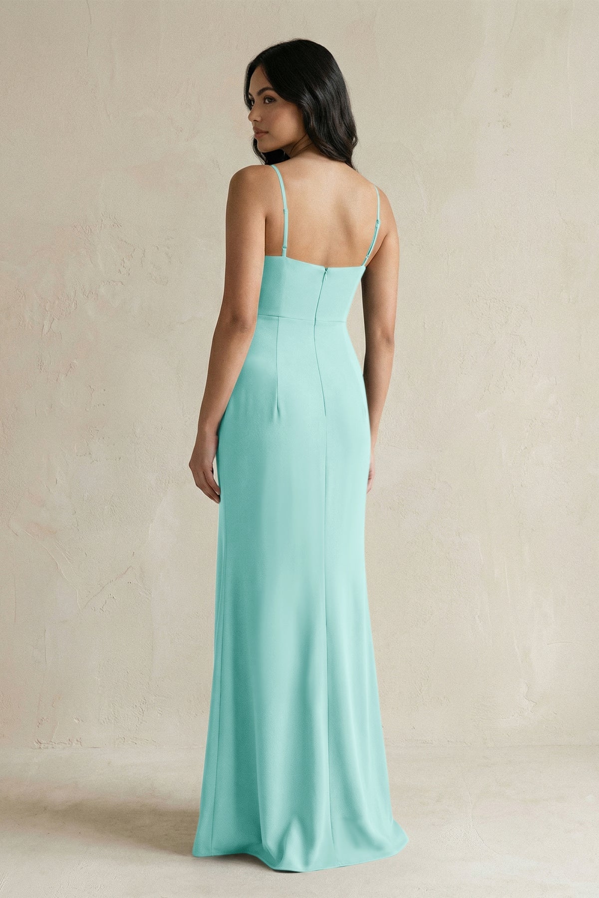 A sleek, elongated silhouette defines this stretch satin bridesmaid dress, with SHEISME focusing on fluid lines and subtle drama. Delicate spaghetti straps trace the shoulders, leading into a smooth, minimalist bodice that keeps the look clean and refined. The sheath silhouette follows the body before extending into a soft sweep train, adding a touch of elegance and movement at the hem. Crafted from stretch satin, the fabric offers a polished finish while allowing for ease and comfort. A side slit introduces natural movement, while the open back adds a striking, modern contrast to the otherwise understated front. Ideal for formal ceremonies or evening celebrations. Available in sizes 0–30 with free custom sizing.