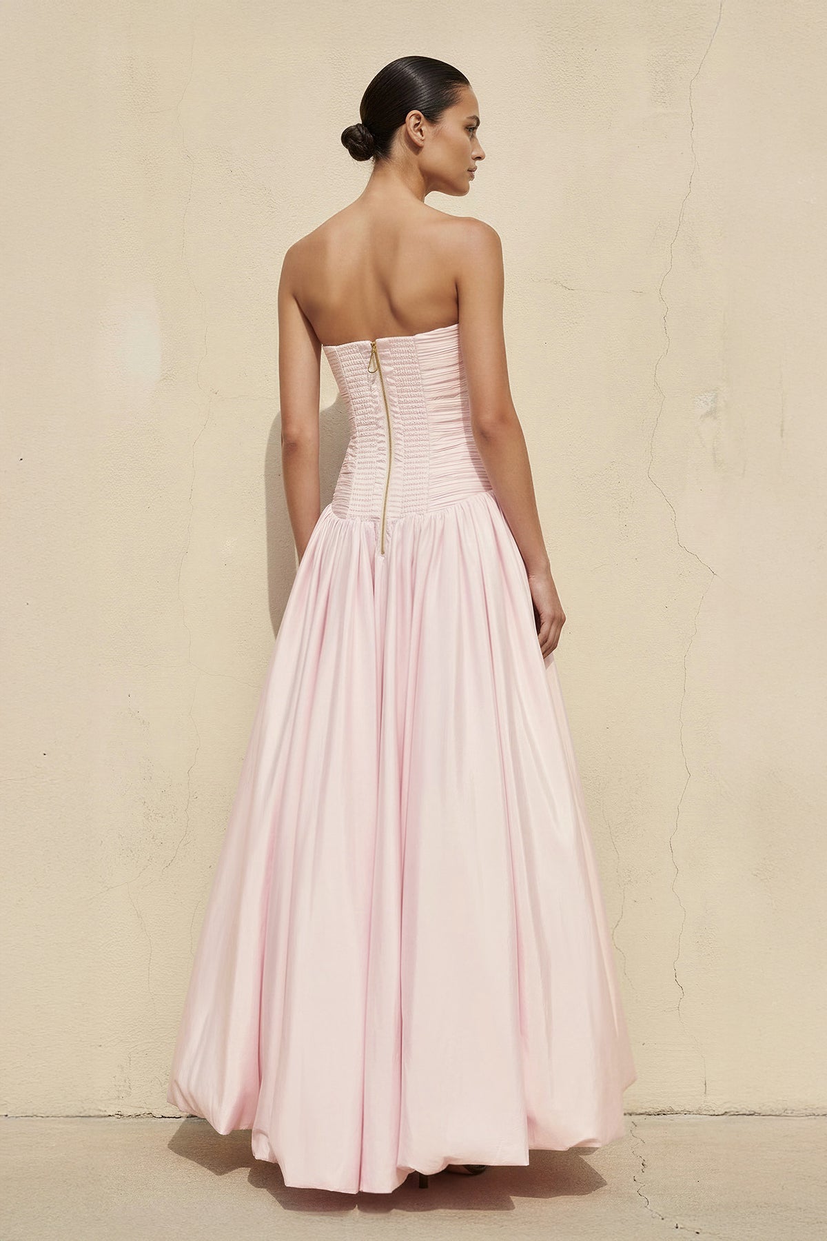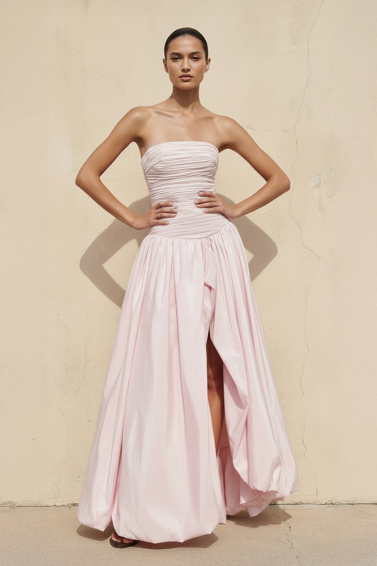 Elevate your formal evening look with the Sheisme pink taffeta sheath maxi dress, designed for sophistication and grace. The strapless neckline and sleeveless design elegantly frame the shoulders, while the sheath silhouette provides a flattering, streamlined fit. Delicate pleating adds texture and subtle movement to the gown, enhancing its feminine charm. Crafted from lustrous taffeta, the floor-length hem flows beautifully, creating an elegant silhouette with every step. A back zipper ensures a secure and tailored fit, making this dress perfect for evening events, gala dinners, weddings, and other formal occasions.