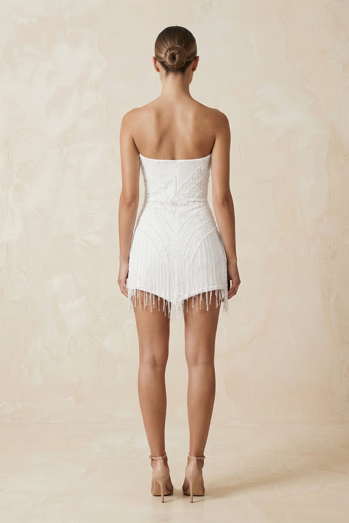 Clean in structure and brought to life through movement, this white sheath mini gown by SHEISME creates a sharp yet playful silhouette. The strapless neckline keeps the upper line smooth and minimal, allowing the sleek shape to stand out. Tassel detailing adds dynamic motion along the edges, creating a soft rhythm that contrasts with the structured base. The mini length enhances the movement, making every step feel light and expressive. Perfect for after-parties, receptions, or brides who love minimal silhouettes with lively, statement detail. Available in inclusive sizes 0–30 with free custom sizing for a personalized, flawless fit.