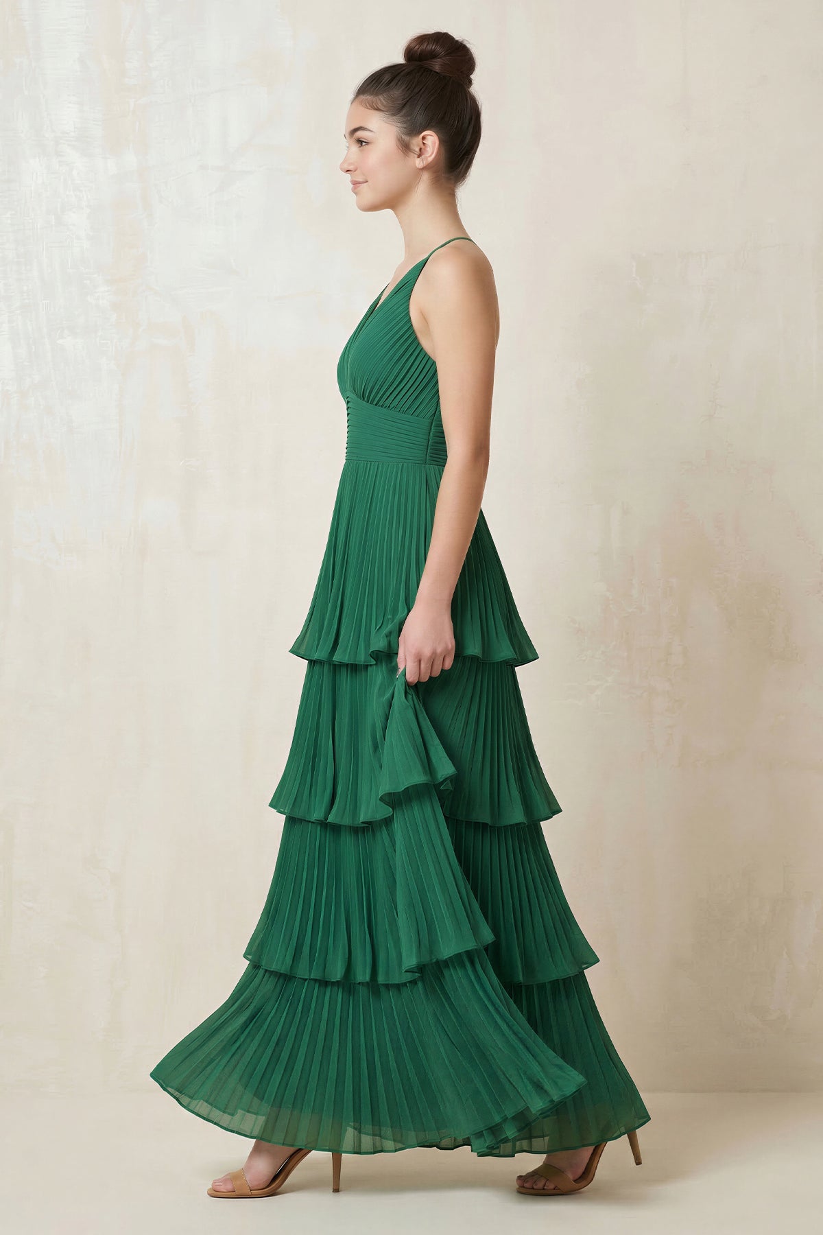 SHE IS ME channels effortless elegance with this dark green chiffon A-line maxi dress, a timeless piece with a graceful, flowing presence. The deep, rich hue adds a sense of depth and sophistication, making it perfect for refined occasions.The V-neckline elongates the neckline and enhances the overall silhouette, while the sleeveless design keeps the look light and polished. Crafted from airy chiffon, the tiered skirt cascades beautifully with layered ruffles, creating soft movement and dimension. A concealed zipper back ensures a clean, streamlined finish.Perfect for evening events, weddings, and elegant gatherings, this dress offers a harmonious blend of classic charm and modern femininity.
